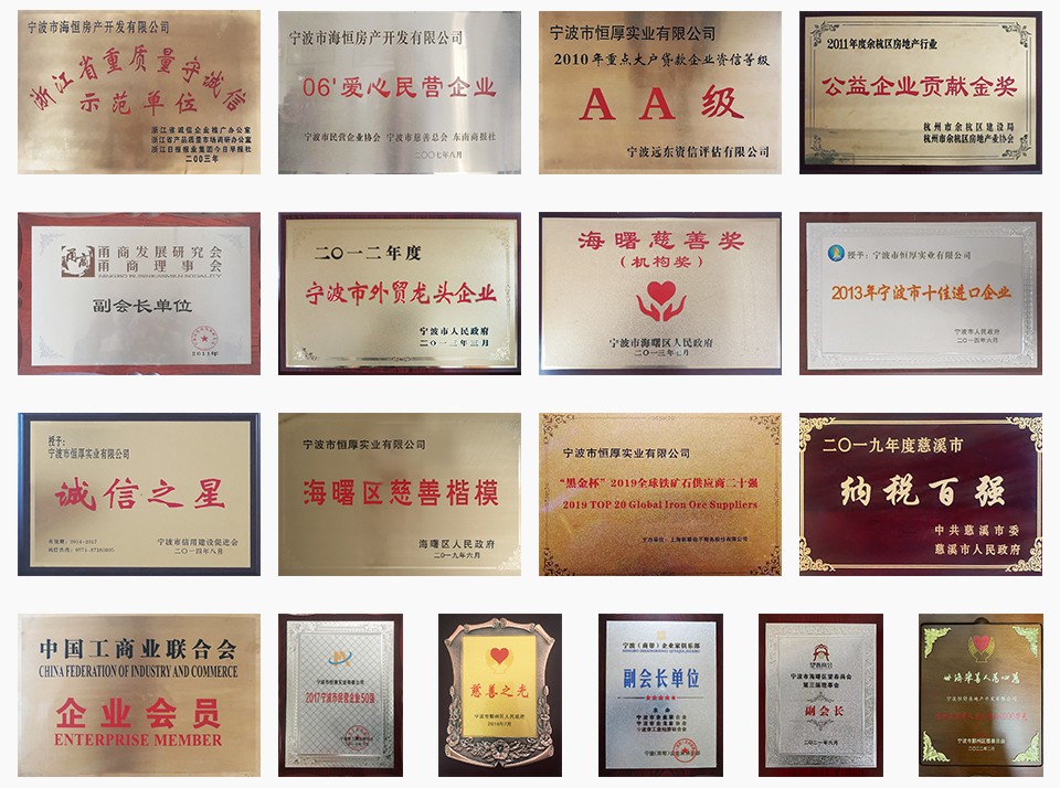 恒厚集團(tuán),31年實(shí)力積淀,勵(lì)志圖強(qiáng),屢獲“寧波市外貿(mào)龍頭企業(yè)”、“寧波市十佳進(jìn)口企業(yè)”、“全球鐵礦供應(yīng)二十強(qiáng)”、“寧波市民營企業(yè)50強(qiáng)”、“浙江省重質(zhì)量守誠信示范單位”等殊榮,是對恒厚集團(tuán)實(shí)力的最有力見證。
